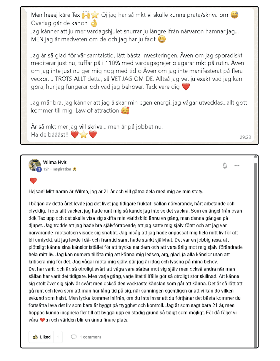 "Tex såg och förstod mig som ingen annan. Idag mår jag mycket bättre, med starkare självbild, bättre disciplin och större förståelse för mig själv och mina känslor. Tveka inte, bara kör. Du kommer bara att utvecklas."
